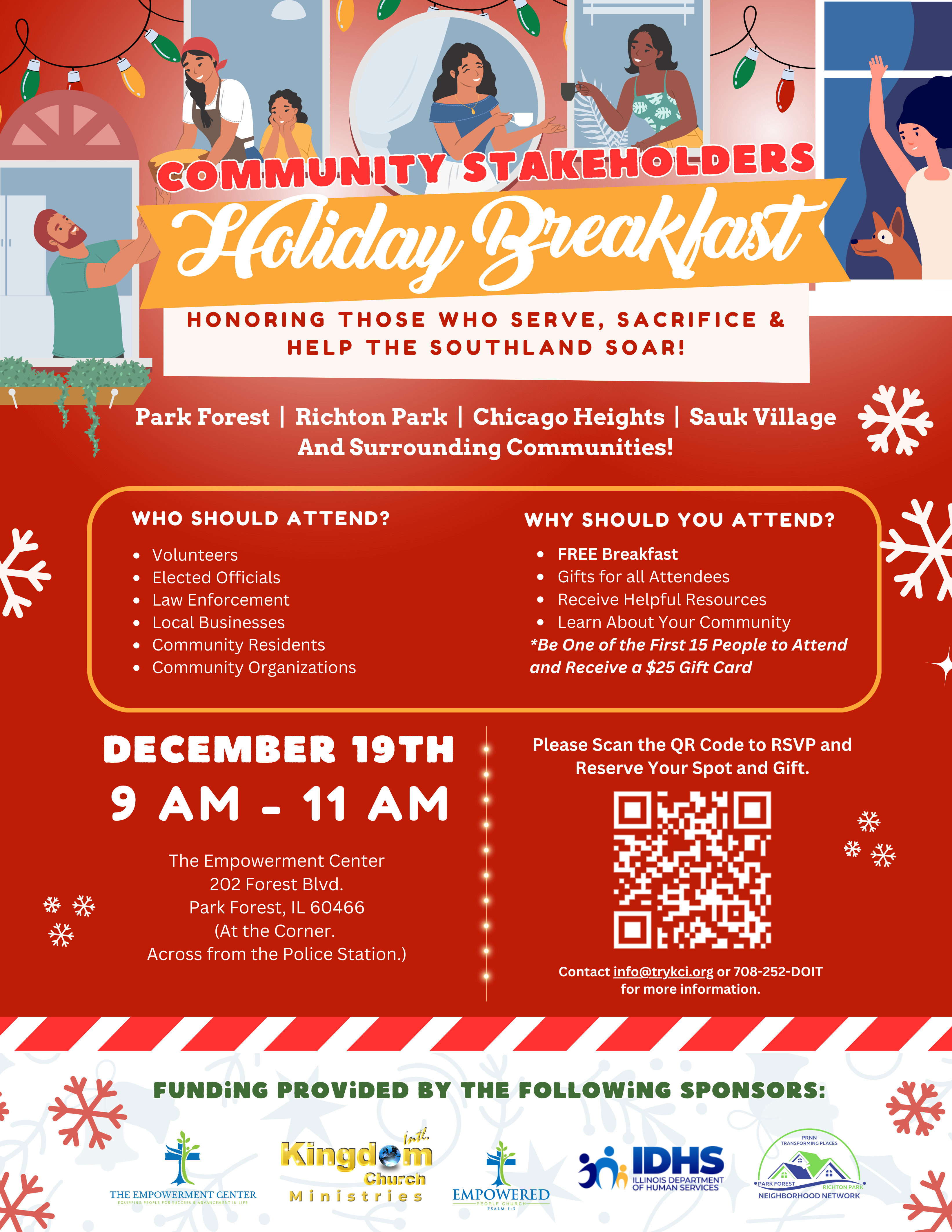 We invite you and the community stakeholders you know to our “COMMUNITY STAKEHOLDERS HOLIDAY BREAKFAST – Honoring Those Who Serve, Sacrifice & Help the Southland Soar!” Our focus is on the Chicago Heights, Park Forest, Sauk Village, and Richton Park municipalities. However, others from the surrounding communities are welcome to attend as long as seats are available.