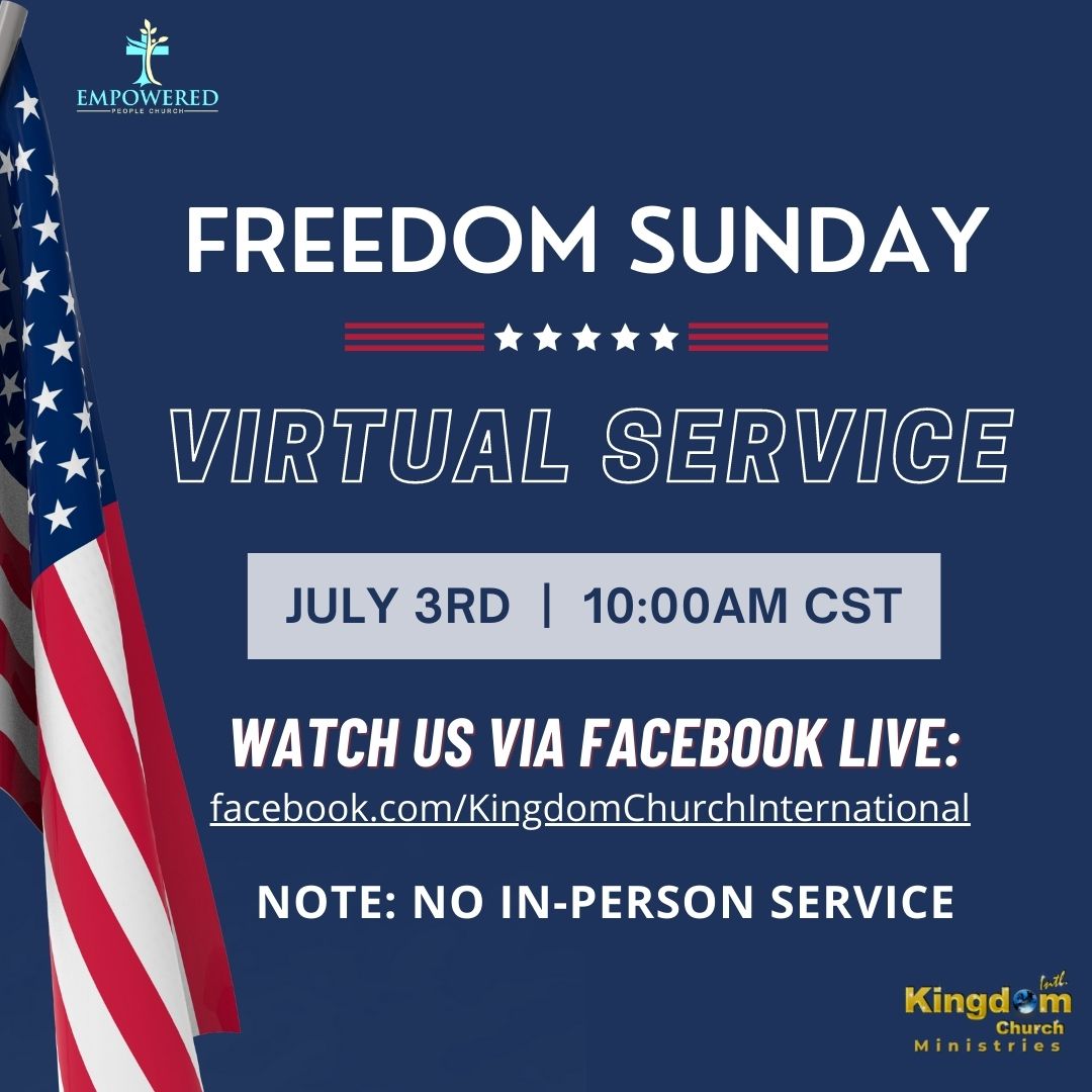 FREEDOM SUNDAY VIRTUAL EVENT Join us Online ONLY for Service! Facebook.com/KingdomChurchInternational