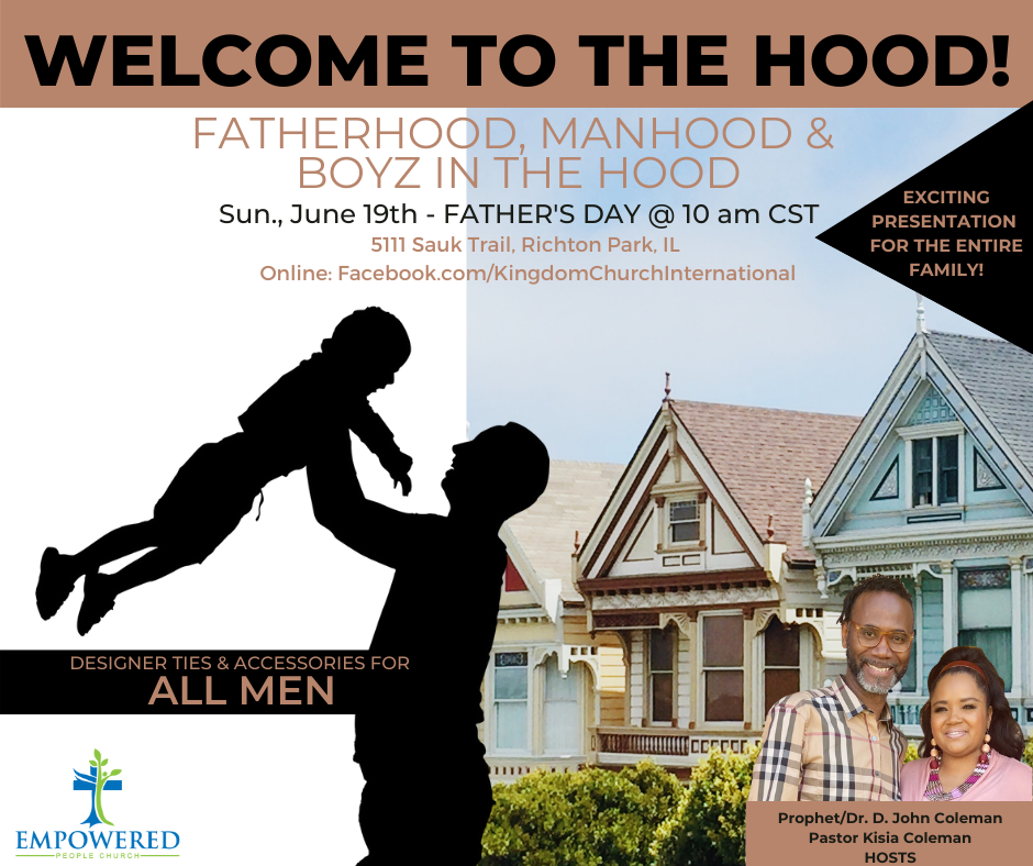 5111 SAUK TRAIL, RICHTON PARK, IL, 60471FATHERHOOD, MANHOOD & BOYZ IN THE HOOD! Join us for this special presentation that will bless the entire family! We will have gifts for all men!