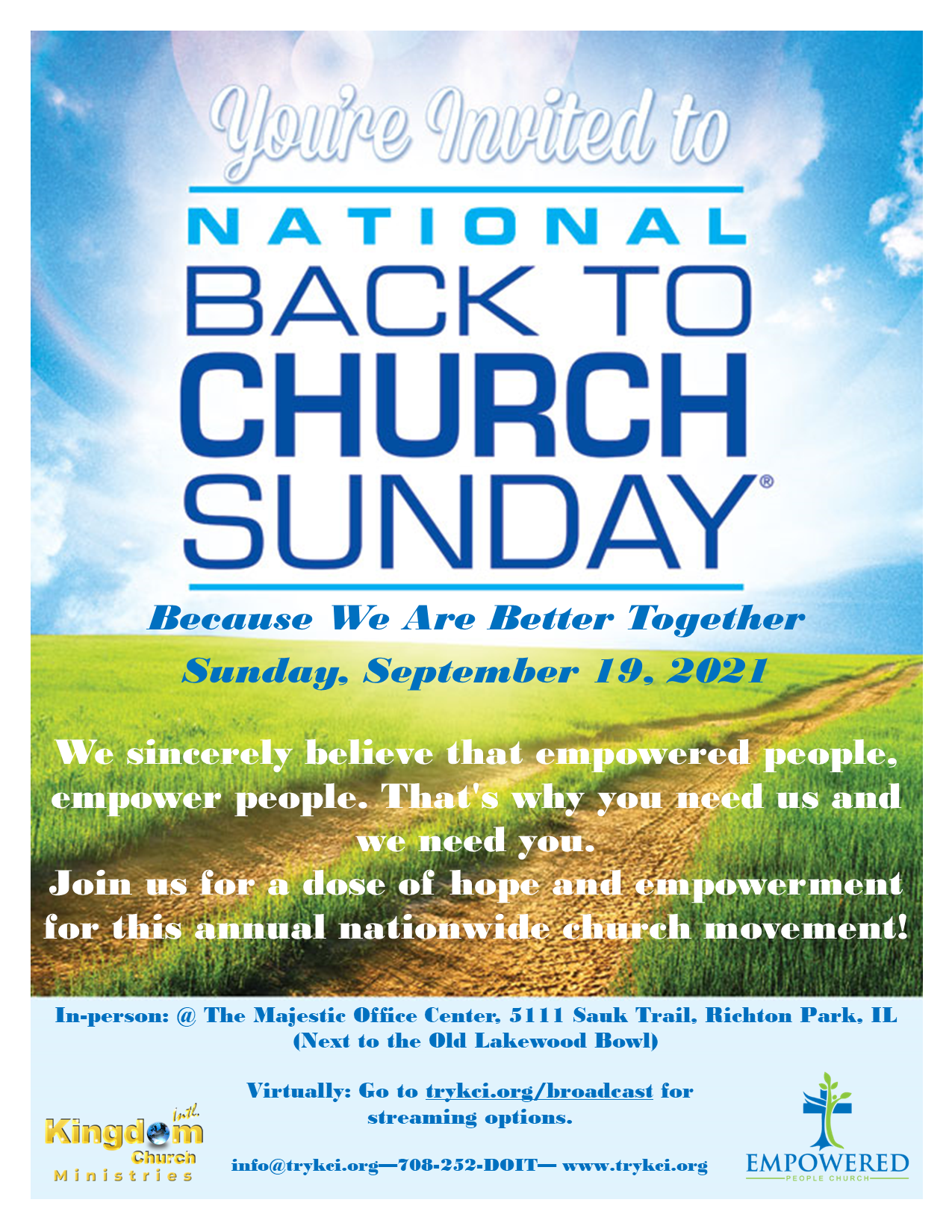 Majestic Office Center 5111 Sauk Trail, Richton Park, IL, United StatesBack to Church Sunday 2021 Because We Are Better Together We sincerely believe that empowered people, empower people. That's why you need us and we need you. Won't you join […]